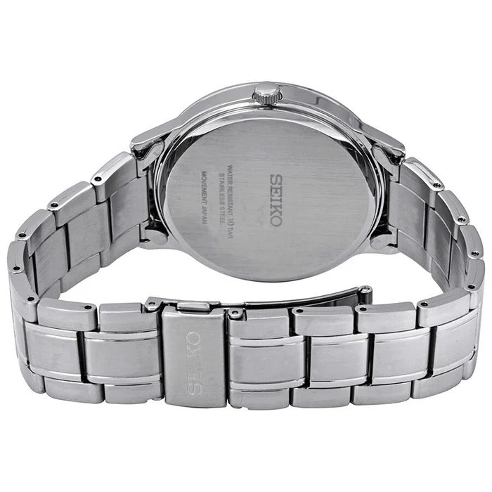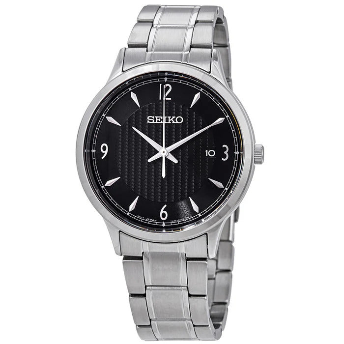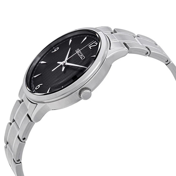Caja de acero inoxidable con brazalete de acero inoxidable. Bisel fijo de acero inoxidable. Esfera negra con manecillas plateadas e índices horarios. Números arábigos marcan las posiciones de las 3, las 6, las 9 y las 12. Minuteros alrededor del borde exterior. Tipo de esfera: analógica. Visualización de la fecha a las 3. Movimiento de cuarzo Seiko calibre 7N42. Cristal Hardlex resistente a arañazos. Corona de presión. Fondo de caja macizo. Forma redonda. Tamaño de la caja: 40 mm. Grosor de la caja: 10 mm. Ancho de la correa: 20 mm. Cierre desplegable. Resistente al agua a 100 metros (330 pies).