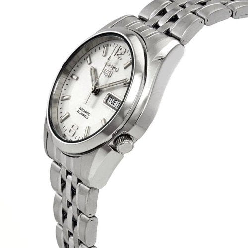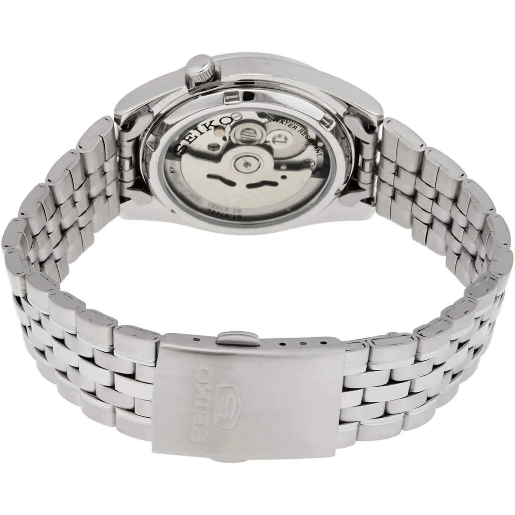 Caja de acero inoxidable con brazalete de acero inoxidable. Bisel fijo de acero inoxidable. Esfera blanca con manecillas plateadas luminosas y marcadores de hora con índices y números arábigos. Los números arábigos aparecen en las posiciones de las 6 y las 12 en punto. Marcadores de minutos alrededor del borde exterior. Tipo de esfera: analógica. Manecillas luminiscentes. Visualización del día de la semana y la fecha en la posición de las 3 en punto. Movimiento automático Seiko calibre 7S26, basado en Seiko 7002, que contiene 21 joyas, con una velocidad de 21600 vph y una reserva de marcha de aproximadamente 40 horas. Cristal Hardlex resistente a rayones. Corona de tirar/presionar. Fondo de caja transparente. Forma de caja redonda. Tamaño de la caja: 38 mm. Grosor de la caja: 10 mm. Ancho de banda: 19 mm. Cierre desplegable. Resistente al agua a 30 metros / 100 pies.