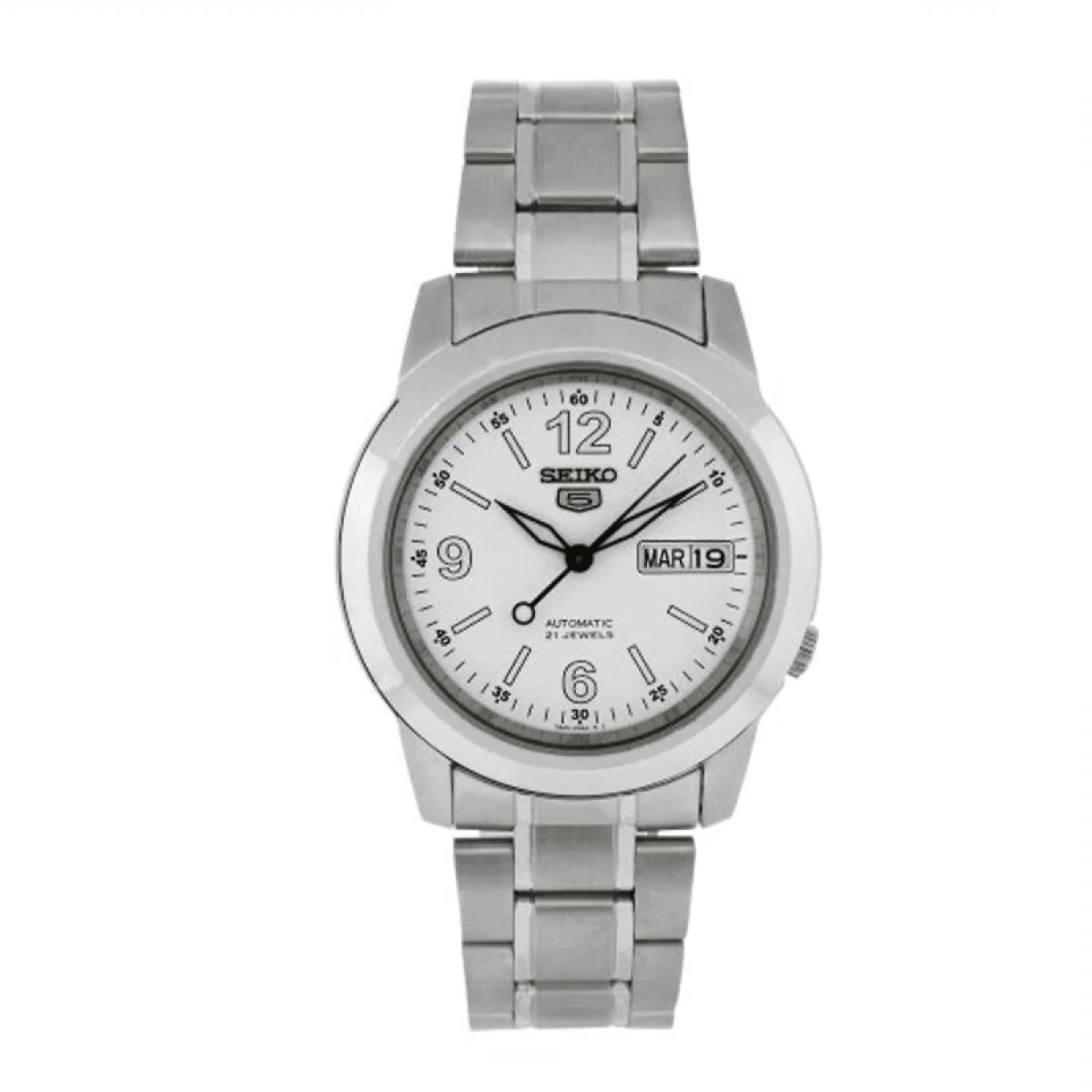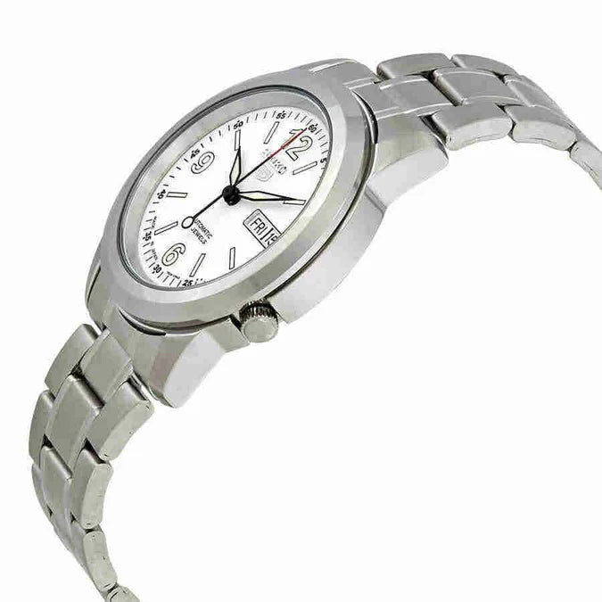 Caja de acero inoxidable con brazalete de acero inoxidable. Bisel fijo de acero inoxidable. Esfera blanca con manecillas y marcadores de hora negros luminosos. Los números arábigos marcan las posiciones de las 6, las 9 y las 12. Marcadores de minutos con números arábigos (a intervalos de 5 minutos). Marcadores de minutos alrededor del borde exterior. Tipo de esfera: analógica. Manecillas y marcadores luminiscentes. Visualización del día de la semana y la fecha en la posición de las 3. Calibre: movimiento automático 7S26 con una reserva de marcha de 41 horas. Cristal Hardlex resistente a los arañazos. Corona de tirar/pulsar. Fondo de caja transparente. Forma de caja redonda. Tamaño de la caja: 38 mm. Grosor de la caja: 10 mm. Ancho del brazalete: 18 mm. Cierre desplegable con botón de liberación. Resistente al agua a 30 metros / 100 pies.