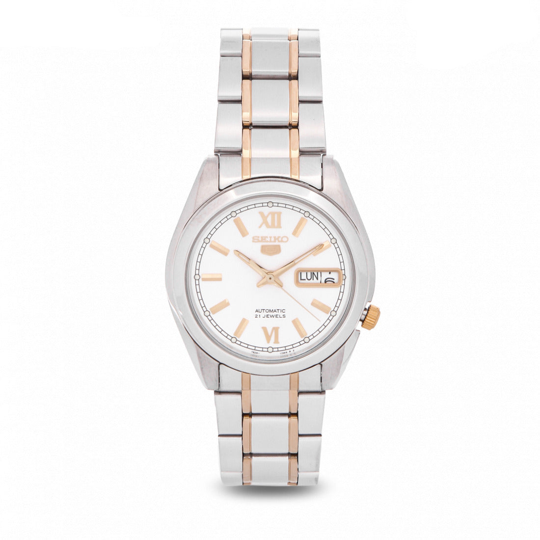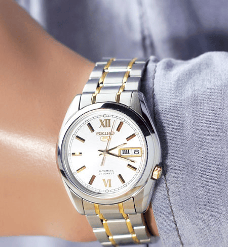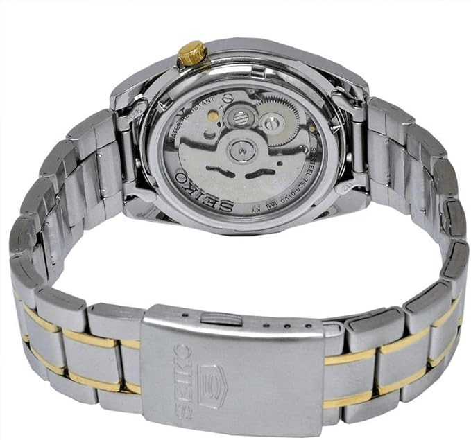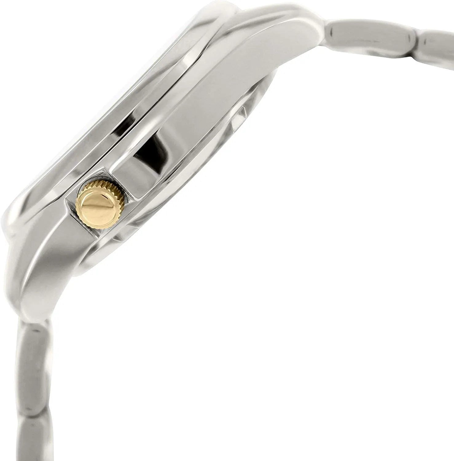 Esfera: Plateada con detalles dorados, Manecillas e índices luminosos, Visualización de fecha y día a las 3 en punto