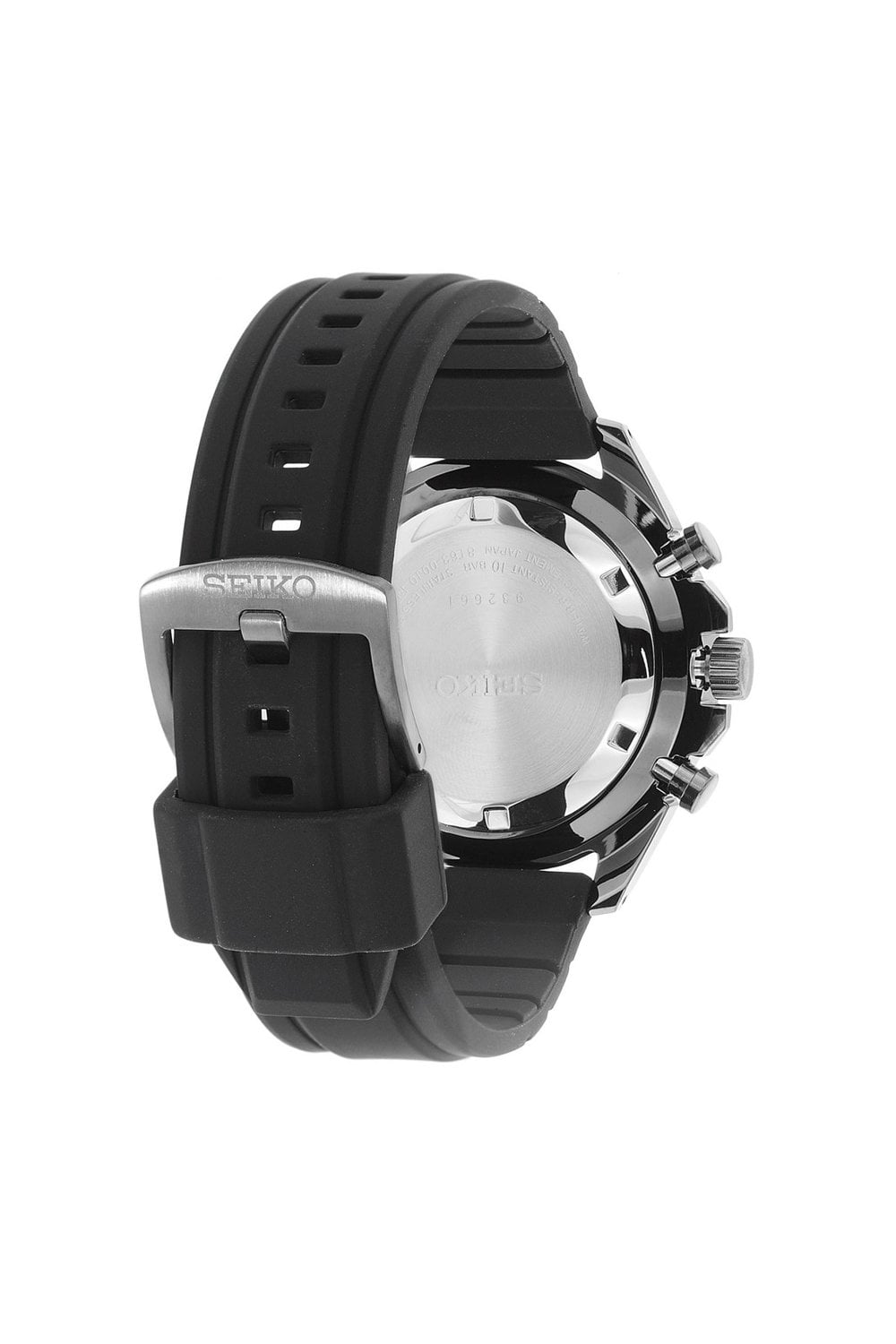 Caja de acero inoxidable chapada en negro con correa de silicona negra. Bisel fijo chapado en negro con marcas de taquímetro. Esfera negra con manecillas plateadas luminosas y marcadores de hora índice. Un número arábigo aparece en la posición de las 12 en punto. Marcadores de minutos alrededor del borde exterior. Tipo de esfera: analógica. Manecillas y marcadores luminiscentes. Visualización de la fecha entre las posiciones de las 4 y las 5 en punto. Cronógrafo: tres subesferas que muestran: 60 minutos, 60 segundos, 24 horas. Movimiento de cuarzo Seiko Calibre 8T63. Cristal Hardlex resistente a los arañazos. Fondo de caja sólido. Forma de caja redonda. Tamaño de la caja: 44 mm. Grosor de la caja: 13 mm. Ancho de correa: 20 mm. Cierre de espiga. Resistente al agua a 100 metros / 330 pies.