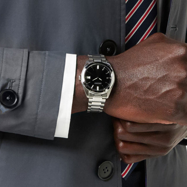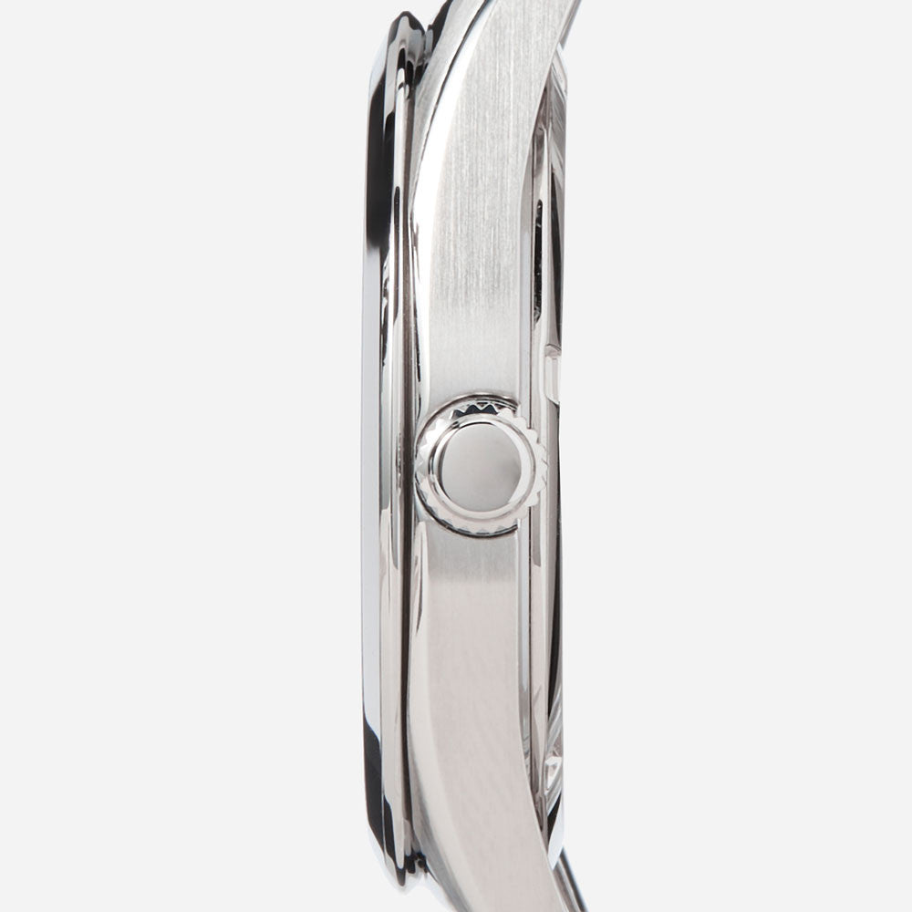 Caja de acero inoxidable con brazalete de acero inoxidable. Bisel fijo de acero inoxidable. Esfera negra con manecillas plateadas luminosas y marcadores de hora. Marcadores de minutos alrededor del borde exterior. Tipo de esfera: Analógica. Manecillas y marcadores luminiscentes. Visualización de fecha a las 3. Movimiento de cuarzo. Cristal de zafiro resistente a arañazos. Corona de pulsación. Fondo de caja macizo. Forma redonda. Tamaño de la caja: 40,2 mm. Grosor de la caja: 8,4 mm. Ancho de correa: 20 mm. Cierre desplegable. Resistente al agua hasta 100 metros (330 pies).
