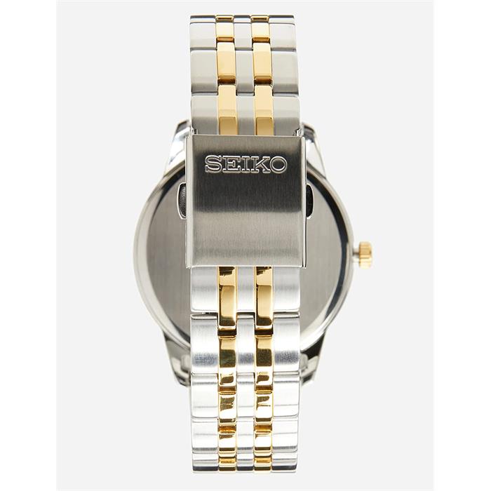 Caja de acero inoxidable pulido y una esfera blanca limpia, refleja sofisticación en cada detalle. Los marcadores de horas en tono dorado y las manecillas añaden un toque de lujo sutil, mientras que su cristal de zafiro, altamente resistente a los arañazos, garantiza durabilidad a largo plazo. Equipado con un mecanismo de cuarzo japonés de alta precisión, este reloj asegura una medición exacta del tiempo. La correa de piel negra de alta calidad proporciona un ajuste cómodo y elegante, ideal tanto para el uso diario como para ocasiones formales. Además, es resistente al agua hasta 50 metros