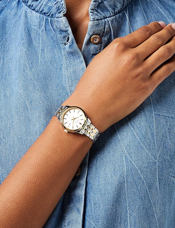 Caja de acero inoxidable pulido en tono plateado y una esfera en tono nácar, este modelo ofrece una estética refinada y moderna. Los marcadores y agujas plateados aportan un toque sofisticado que lo convierte en una opción ideal para cualquier ocasión, ya sea una reunión formal o un evento casual. Su movimiento de cuarzo japonés garantiza precisión y fiabilidad, mientras que la resistencia al agua de 50 metros