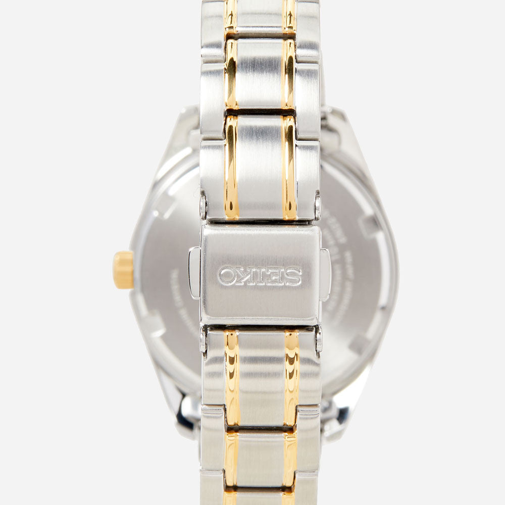 Caja y brazalete de acero inoxidable bicolor con cierre desplegable en Z. Esfera blanca transparente con números arábigos negros de dígitos completos y manecillas doradas con segundero. Esfera muy nítida y fácil de leer. Fecha a las 3 en punto. Cristal de zafiro resistente a arañazos, prácticamente imposible de rayar.