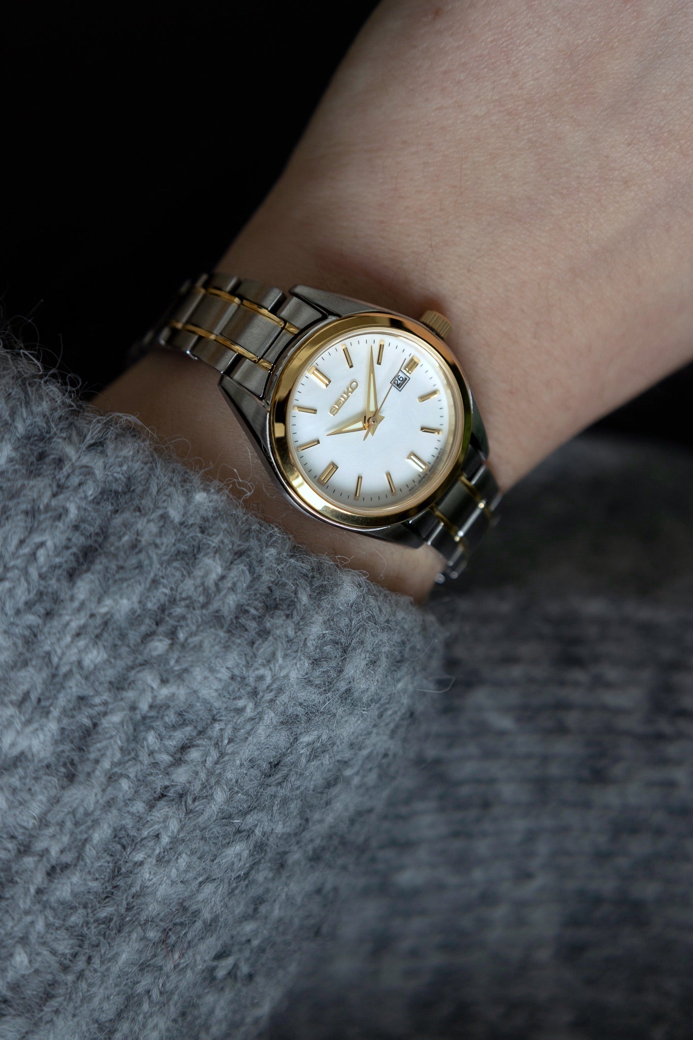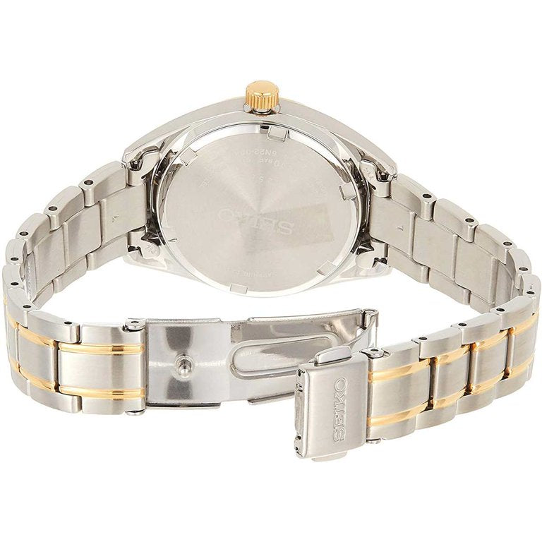 Caja de acero inoxidable con brazalete de acero inoxidable bicolor (plateado y dorado). Bisel fijo dorado. Esfera blanca con manecillas luminosas doradas y marcadores de hora en números romanos. Marcadores de minutos alrededor de un anillo interior. Tipo de esfera: analógica. Manecillas luminiscentes. Calibre: movimiento de cuarzo 6N01. Cristal Hardlex resistente a arañazos. Corona de pulsación. Fondo de caja macizo. Forma redonda. Tamaño de la caja: 29,2 mm. Grosor de la caja: 8 mm. Ancho de correa: 14 mm. Cierre desplegable con pulsador. Resistente al agua hasta 100 metros.