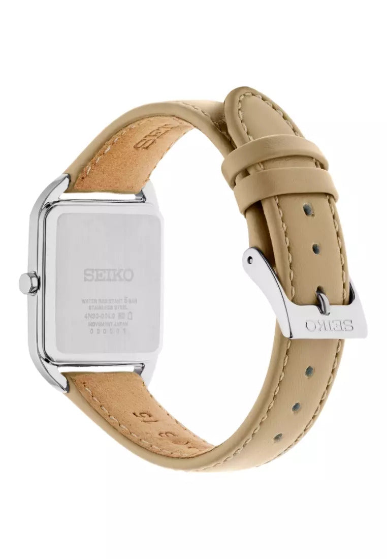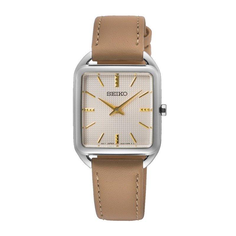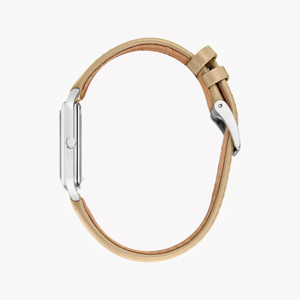 Caja de acero inoxidable plateada con correa de piel marrón. Bisel fijo de acero inoxidable plateado. Esfera beige con agujas e índices dorados. Corona de presión. Fondo de caja macizo. Forma rectangular, tamaño de la caja: 26 mm, grosor de la caja: 6,4 mm. Ancho de correa: 15 mm. Cierre de hebilla. Resistente al agua hasta 50 metros (165 pies).